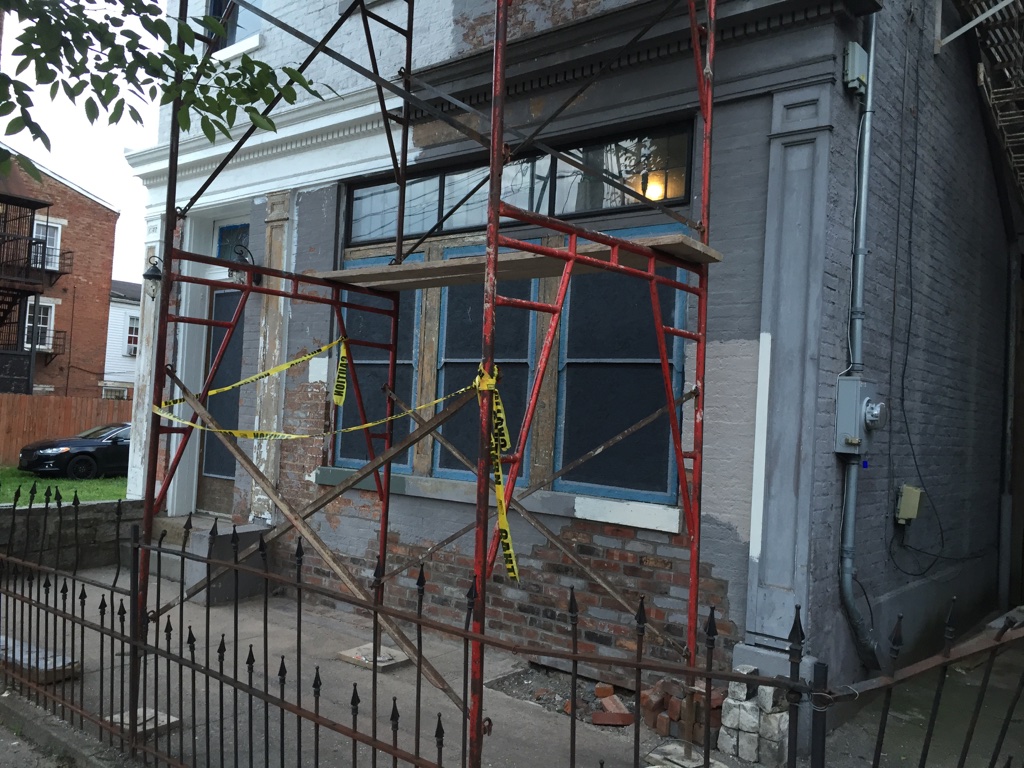 thumb_img_9094_1024 September 28, 2016 1024 × 768 Woodworking in America 2016 (Part 2) Pig sticker fence. I also really like how the guy restoring this row house painted the CDX on the door to look like a door and even layered it on the windows and painted them to look a bit like sash. Nice touch. (Photo by Bill Rainford 2016)