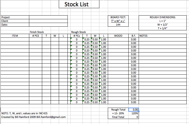 Back when I was a student at the North Bennet Street School they had a nice little photocopy of a stock list that looked like it was originally made in Excel. We’d enter all the details for our project and then calculate the board footage for our projects by hand with a calculator. This often tedious work was susceptible to the occasional human error so I’d usually wind up checking and rechecking my calculations as I went. After doing this a few times, the computer scientist in me thought ‘Wait a minute, I can code this up in Excel and let it do all the work for me’ — plus printing this spreadsheet for a customer or when dealing with a supplier looks better than a hand written version.