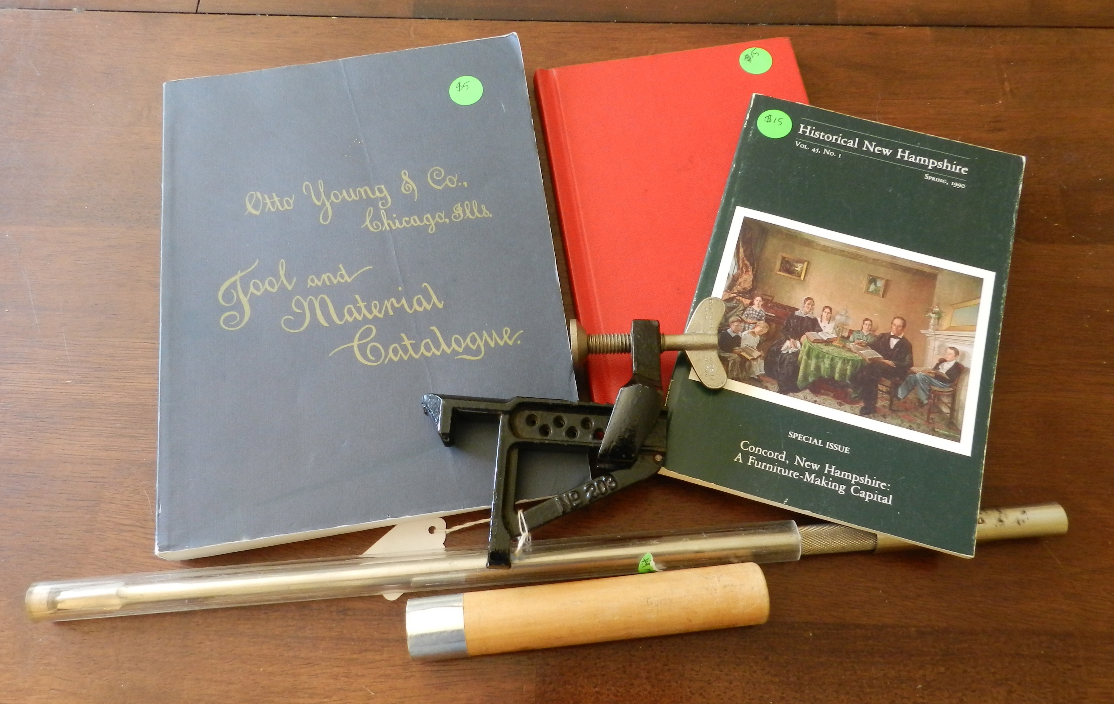 I tried my best to get out without buying anything — especially since the Nashua Live Free or Die Tool Show and Auction is coming up in a couple of weeks, but it’s like Ed knew I was coming. I found a great reprint book on Concord NH furniture makers, a book on the Shaker Barn full of tools at the Shelburne Museum in VT which I wrote about here, a MWTCA reprint of a tool catalog, a nice old Stanley auger bit extension for use with a bit brace, and a Stanley 203 bench clamp. This neat little clamp is something I’ve looked at in the past — and makes a nice addition to any bench with a sliding deadman. I look forward to giving it a try.