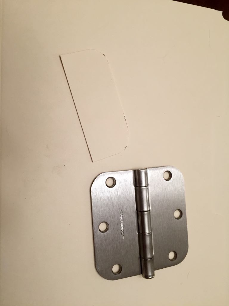I grabbed a manila folder and traced one of the hinge leaves onto the folder. I then cut out what I traced being sure to ‘take the line’ that way I could be sure the template would fit. Also by leaving the folder folded up I could get two shims from each cutting operation. I would test fit the shim and use one as the template for subsequent operations. Also make sure the shim only fills the area where wood would be under the hinge, you don’t want the shims going all the way out to the knuckle of the hinge where they would be visible. Once I had a small stack of these shims I could take a few test fittings and see how many I needed to pad out the hinge so it would be flush with the door jamb or door surface. I would then scotch tape the shims (if I needed to use more than 1) to each other and into the jamb using a small loop of tape. With the shim(s) in place the I’d use the same screw installation procedure described above.