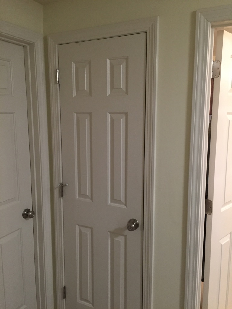 AFTER: Properly adjusted door with new Schlage ‘Georgian’ style knobs. The knobs and hinges are finished in brushed nickel.
