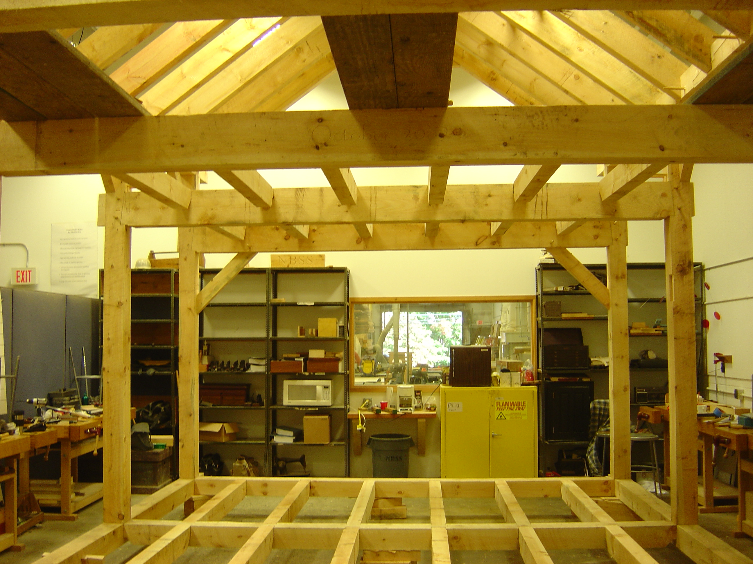 You’re raising a barn inside?! Yep, it’s not every day you get to raise a barn indoors, but back in the fall of 2009 the NBSS PC2 class of 2010 raised Matt’s timber frame barn inside of the class room. The frame is a 1.5 story barn/workshop cut using square rule joinery. The frame is eastern white pine.