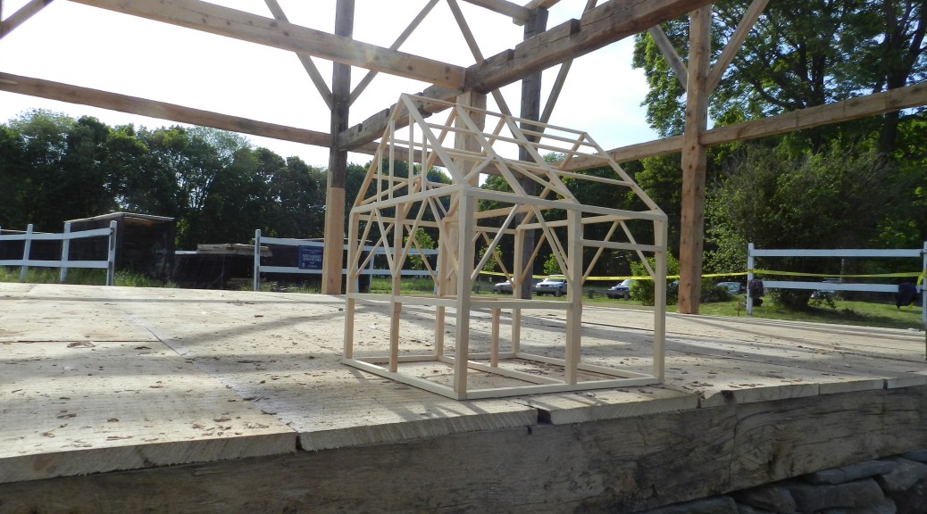 On Friday 5/18/12 I was able to participate in an unusual barn raising at the Brookwood Farm in Canton MA. It was the culmination of several years of work by North Bennet Street School students and instructors. The barn is unusual in that it is one of, if not the oldest known surviving 2 bay English style timber framed barns in New England. (I documented some of the history in earlier posts on this topic if you are interested) The barn is also interesting in how it was framed — with 2 bays being asymmetric and an interesting use of rafters and purlins.