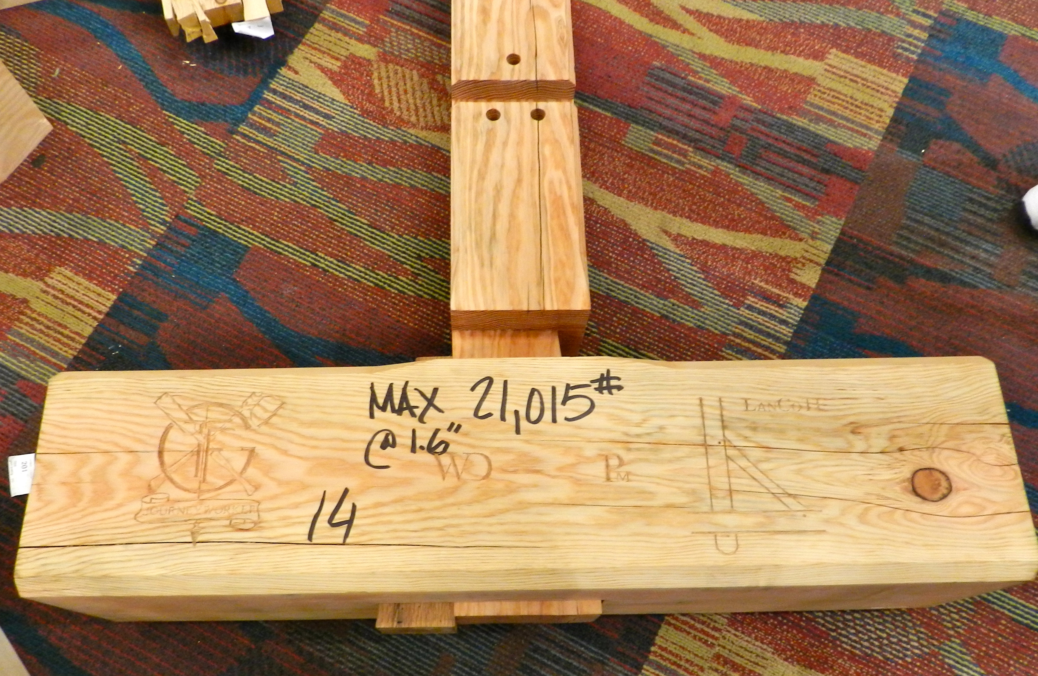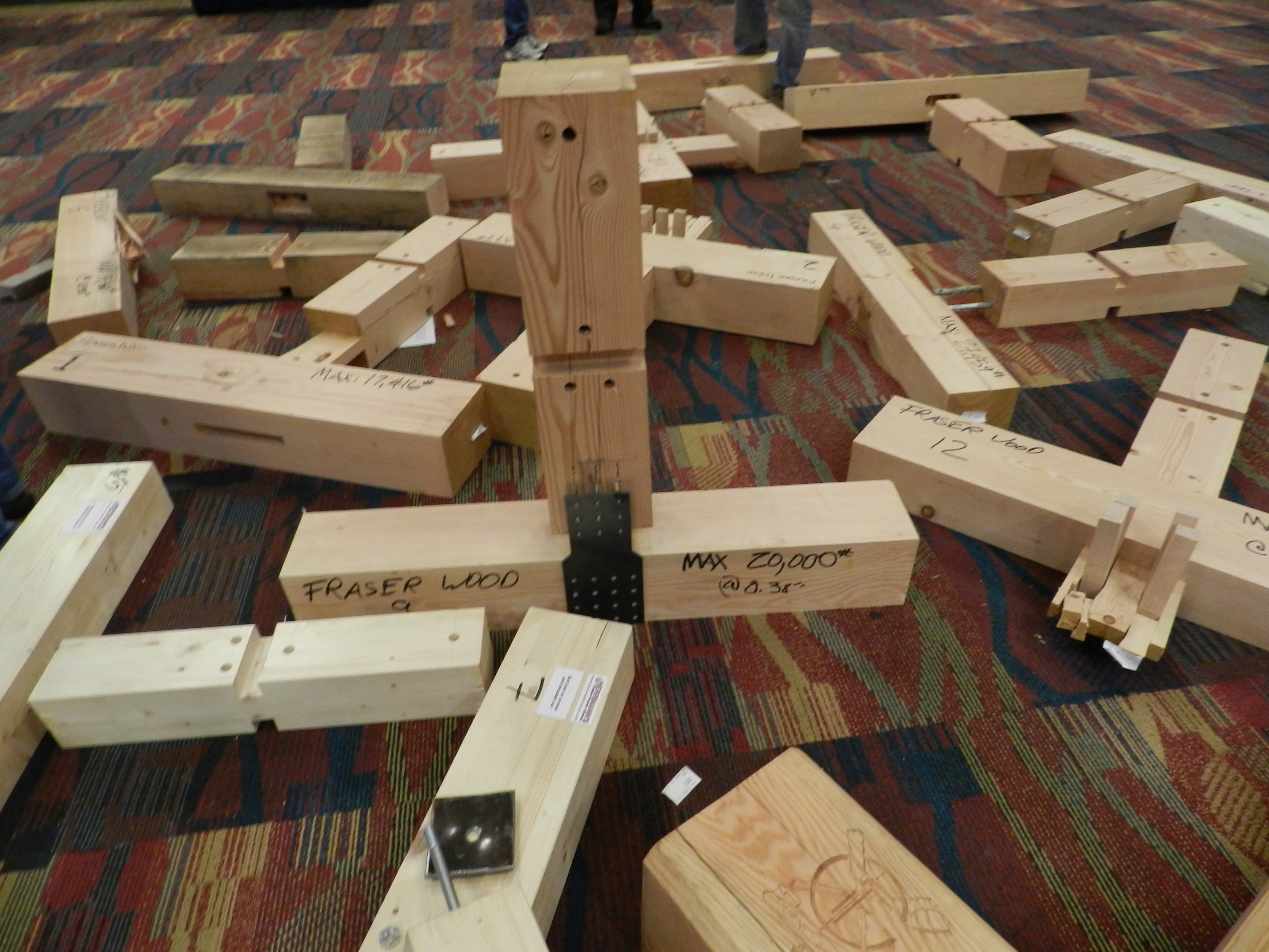 BANG — CRACK — SNAP — JOINT BUSTING! In a corner of the trade show portion of the conference during the inter-session breaks we got to see a lot of the joint busting competition. Basically you build a timber framed joint meeting some specific size specifications and it is placed into a hydraulic or pneumatic press that will apply an incredible amount of pressure to see what it would take to cause the joint to fail. This info is projected on the screen and also logged by computer sensor for research purposes. When the joint fails it often makes quite the sound.