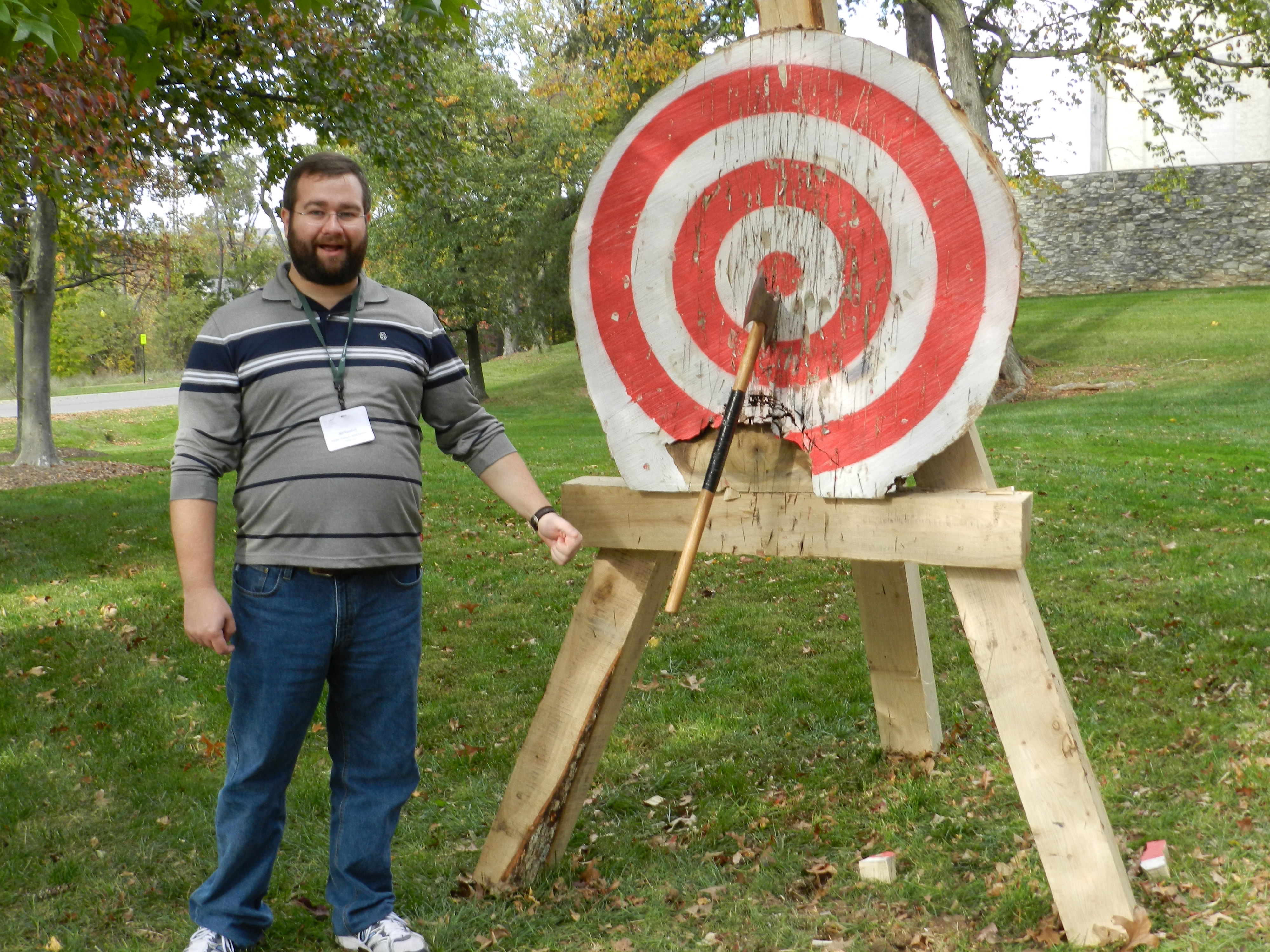 Kim Catlin (NBSS Graduate) Throwing an AxeBill Rainford (NBSS) Throwing an AxeAxe in flightBill Rainford (Me) standing next to my bullseye shot