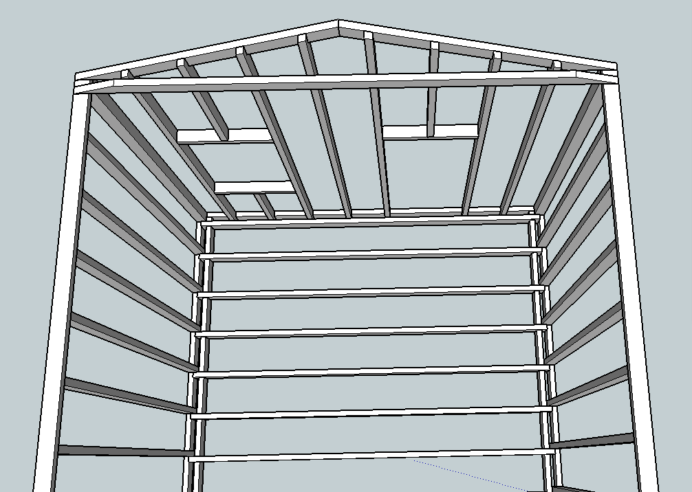 A great period resource for information about Balloon Framing is William Bell’s “Carpentry Made Easy: The Science and Art of Framing”. While Bell was not the first author to extol the virtues of Balloon Framing he may have been one of the most prolific. His ‘Carpentry Made Easy’ book was published continuously from 1858-1904. 46 years is quiet a testament to the information he provided. The book’s longevity is largely due to how the information is provided. Bell starts with a detailed section on basic math and geometry for carpenters and the moves into framing. He covers Balloon Framing for homes and modest sized buildings and moves on to heavy timber framing for industrial buildings, bridges, spires and the like. Bell was a trained carpenter and joiner and speaks the reader in a clear and concise way that was agreeable to most carpenters. Bell goes into technical detail but did so in such a way that any reasonably skilled carpenter could take this information and apply it to the project at hand. His words still resonate well today — in fact using his descriptions I was able to build a detailed 3D model in Sketch-Up based on his instructions for how to build a Balloon Framed structure. (See Figures 1 and 5). I’m sure that many a house carpenter had a dog-eared copy of this book in their toolbox and regularly referred to it over the years.