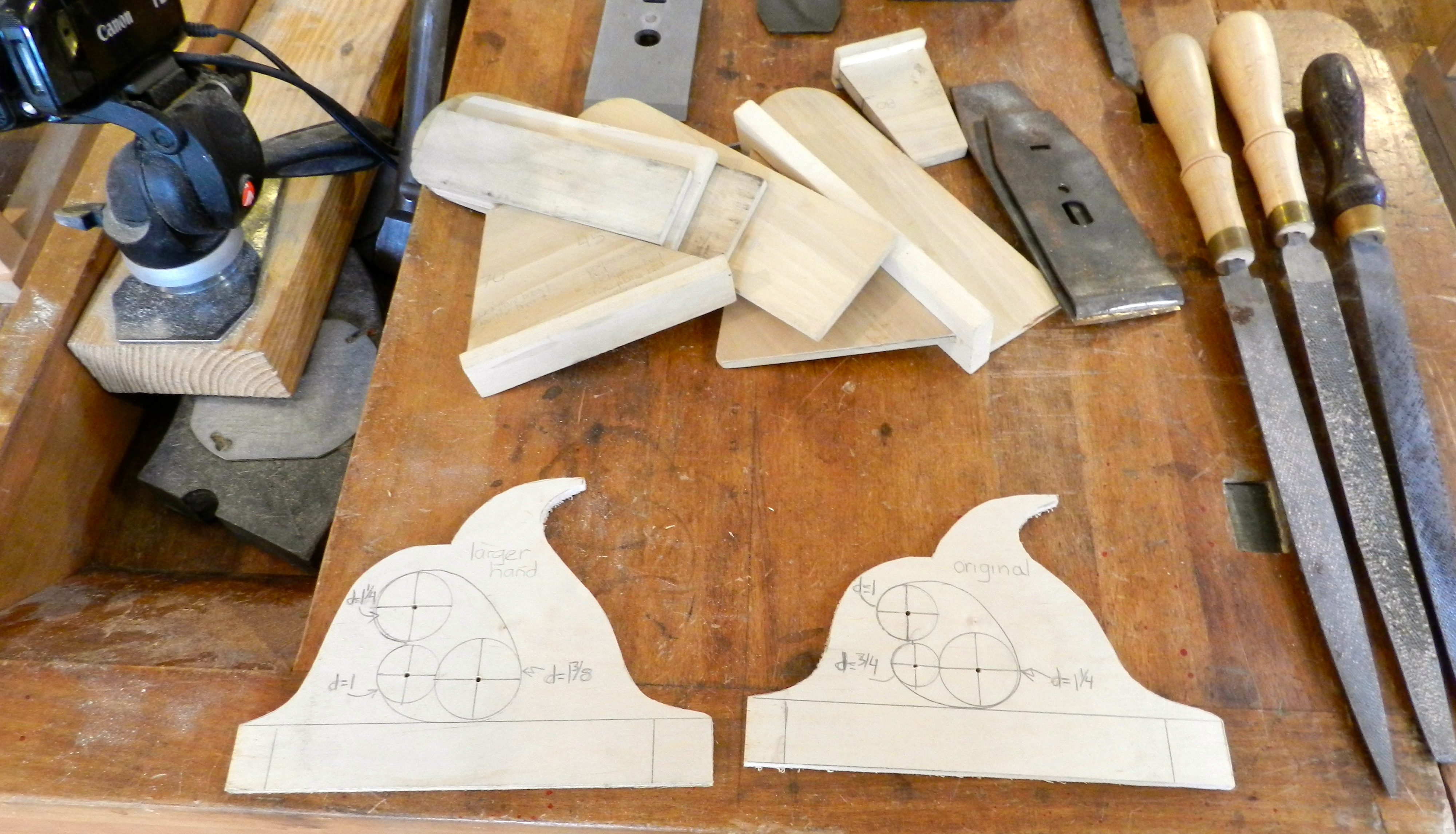 Above you can see some of the many gauges used in laying out and testing parts of your plane, along with templates for the handles.