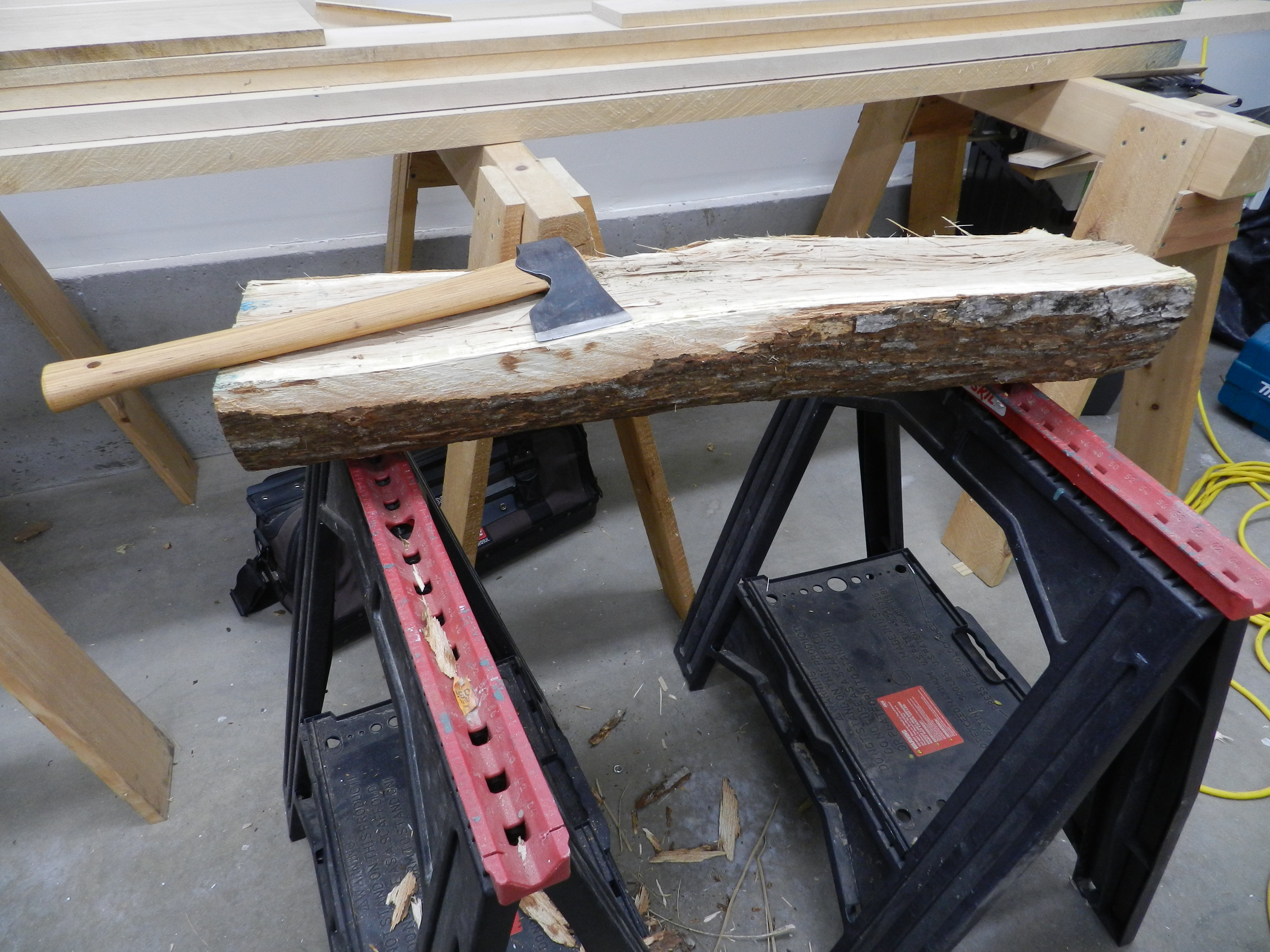 Back again in the shop I squared up the edges of the log with a hatchet. Being a green piece of wood this razor sharp ax made quick work of it.