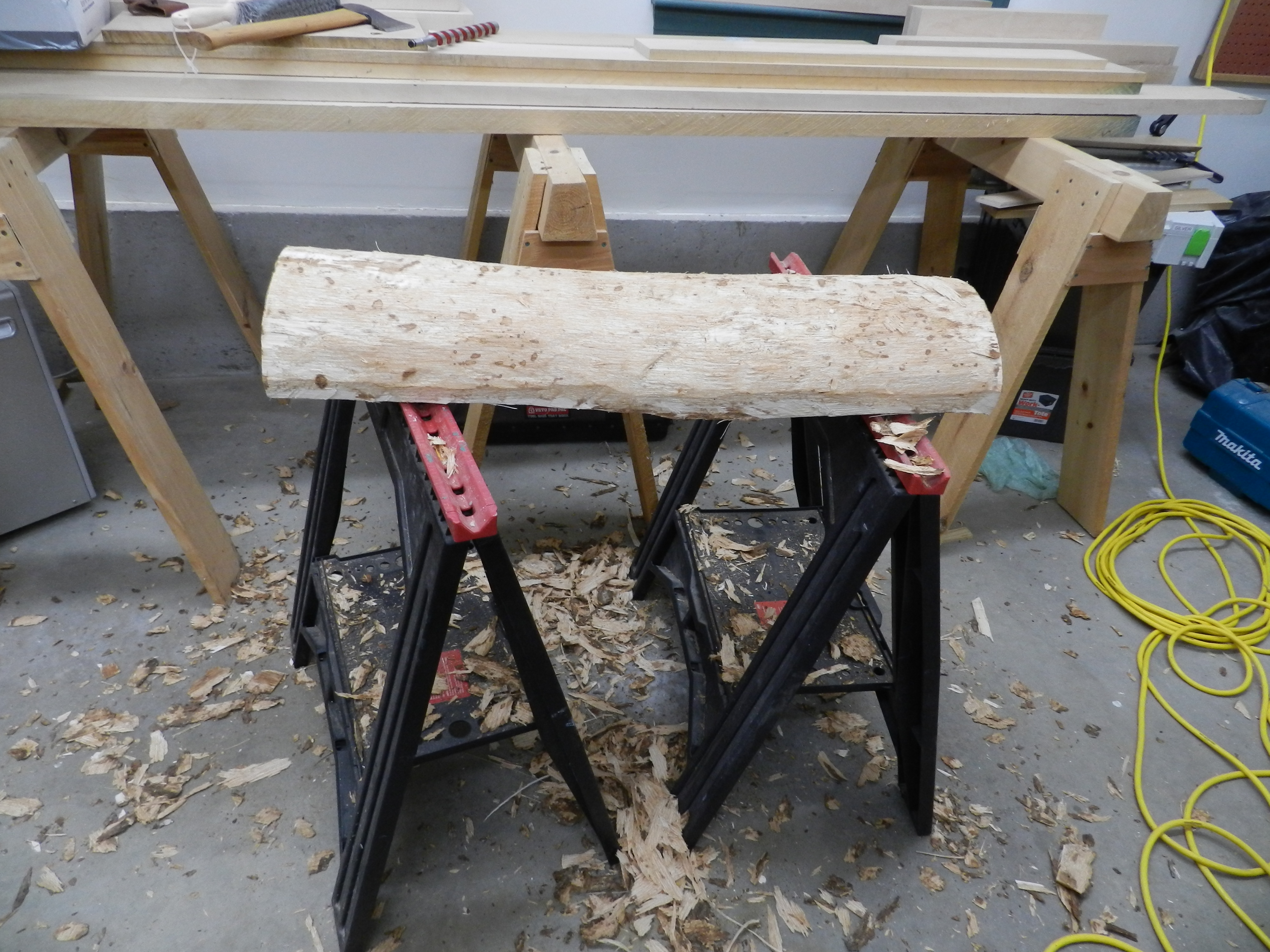 De-barking the log on the right. A metal post hole digging bar makes a good impromptu barking spud.