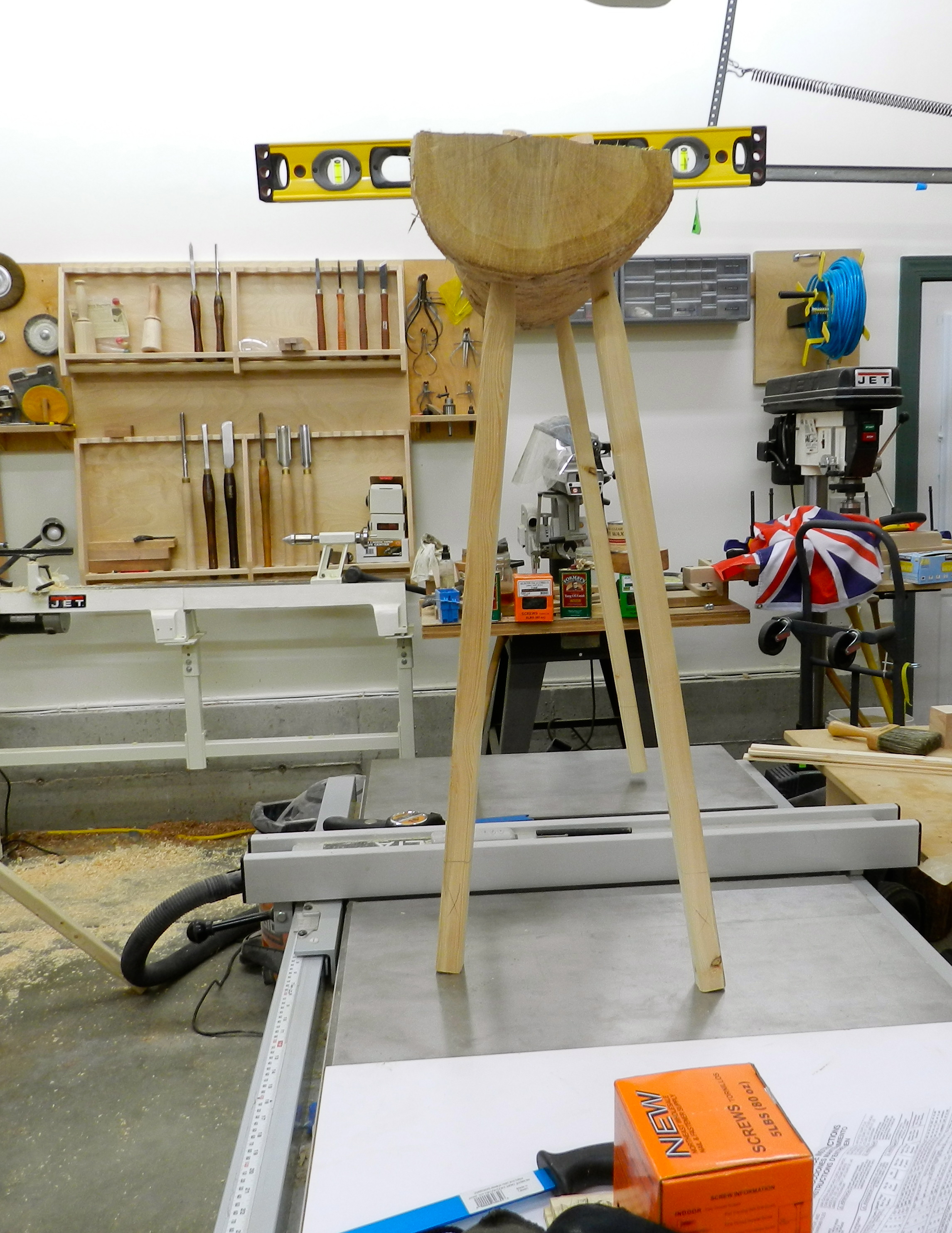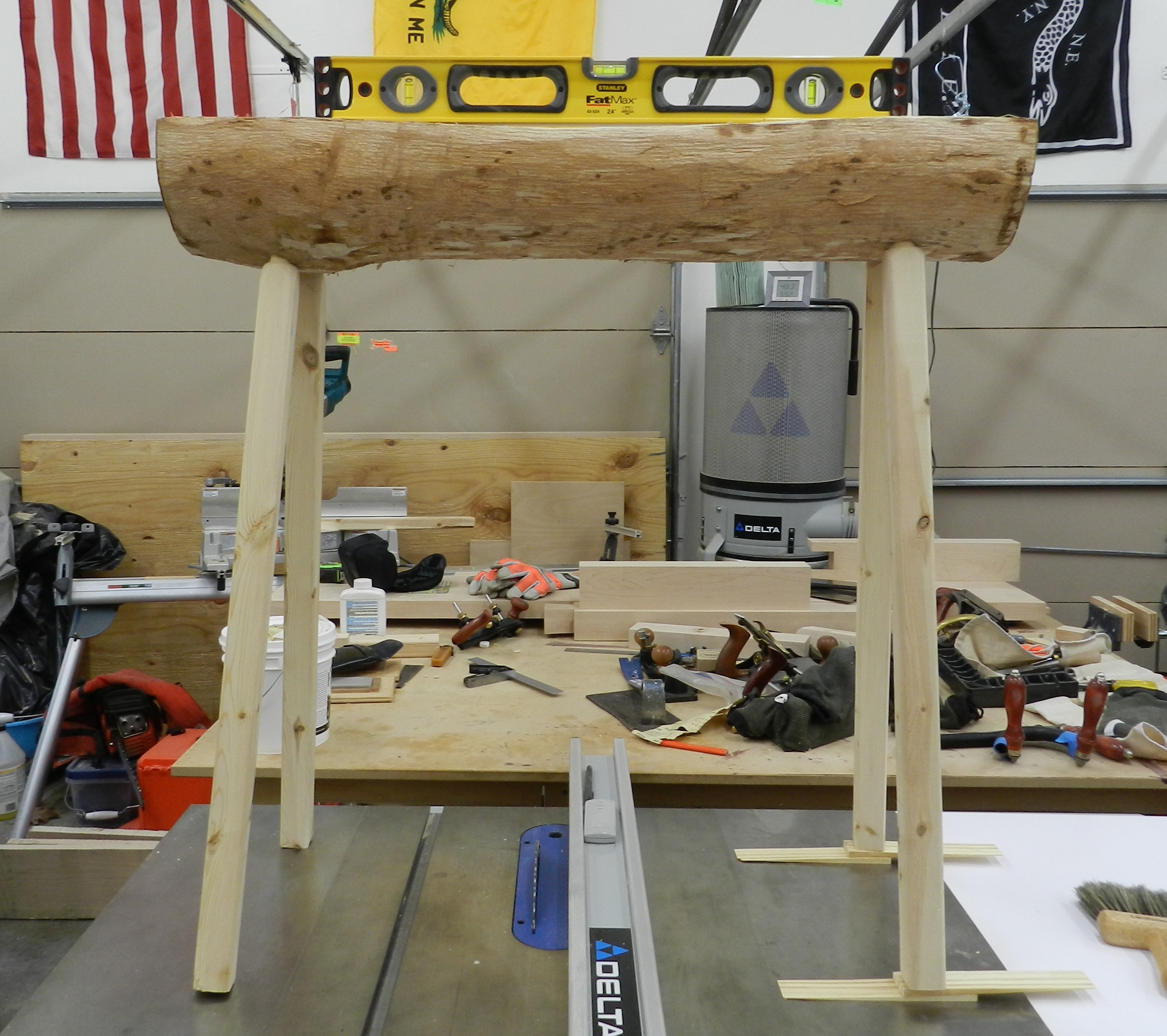 Now the bench is read for use in the shop. This bench, with it’s delicate looking legs, can hold me standing on it, so it should have no problem handling my in shop hewing needs.