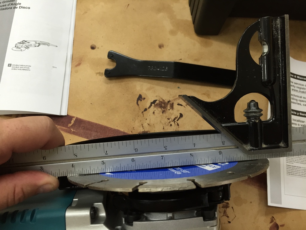 Unfortunately the heavy housing/guard and mechanism reduce this 7″ blade to a 1-3/4″ cutting depth, but I need 2-1/4″+ to clear cut a brick, so after all of this the grinder and blades will be going back to the store and I’ll have to special order a 9″ grinder and diamond blade online. The good news is the 9″ model is virtually the same machine, just with a bigger safety housing that can accommodate the 9″ blade so the flat inner flange should work with that unit as well. The Makita 9″ model grinder only seems to cost about $10 more, though the diamond blades are more expensive in the 9″ size. I’ll be sure to post about the actual cutting when I have the new machine in hand. 🙂