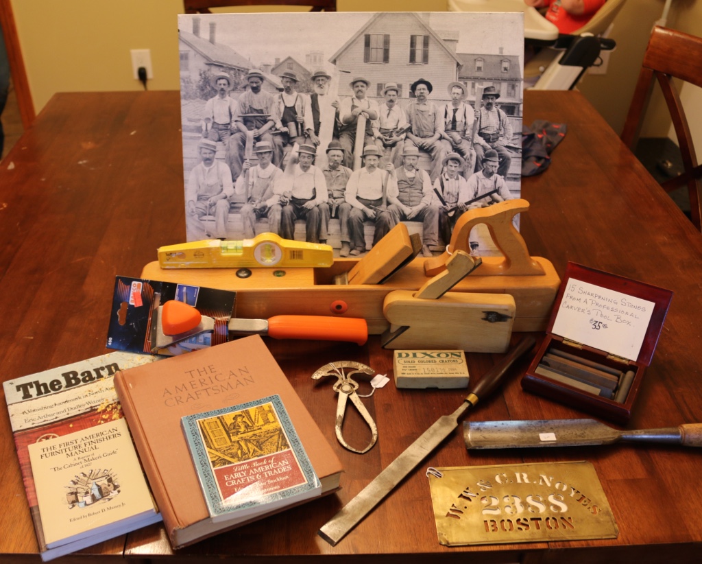 And now on to what I bought. I happy to say I didn’t spent too much this year and got some interesting items. From left to right: Some interesting books (The Barn, The First American Finishers Manual, The American Craftsman, and the Little Book of Early American Crafts &Trades). A new in package Bahco scraper, New in package Stabilia Torpedo Level (I’ve had one for years that lives in my toolbelt so its nice to have a spare/one for the shop), Ulmia Jointer Plane, ECE Shoulder Plane (Being of German Descent, and the fact that Americans don’t seem to like these sorts of plane, it has been interesting to collect and test out German style tools in my shop), Inside/Outside Calipers similar to what you see in the Studley Tool Cabinet, Dixon wood marking crayons donated by a friend, Paring Chisel with modern handle crammed on, a nice box of small carvers slip stones, a nice big gouge for coping when timber framing, and a very neat brass stencil given to me by Cynthia and George Short that says “W.W. & C.R. NOYES, 2388, BOSTON” that was likely used to mark crates or similar objects. As I have been reading up on Civil War re-enactors who build their own furniture, crates etc it was something I wanted to try out. So if anyone out there knows who the Noyes were or what they sold I would be interested to hear from you. The prior owners contacted some historical societies and didn’t get a firm answer. I’m hoping to use it as a model as I eventually want to make my own similar stencil with my own name on it. I’ll be sure to post about it.
