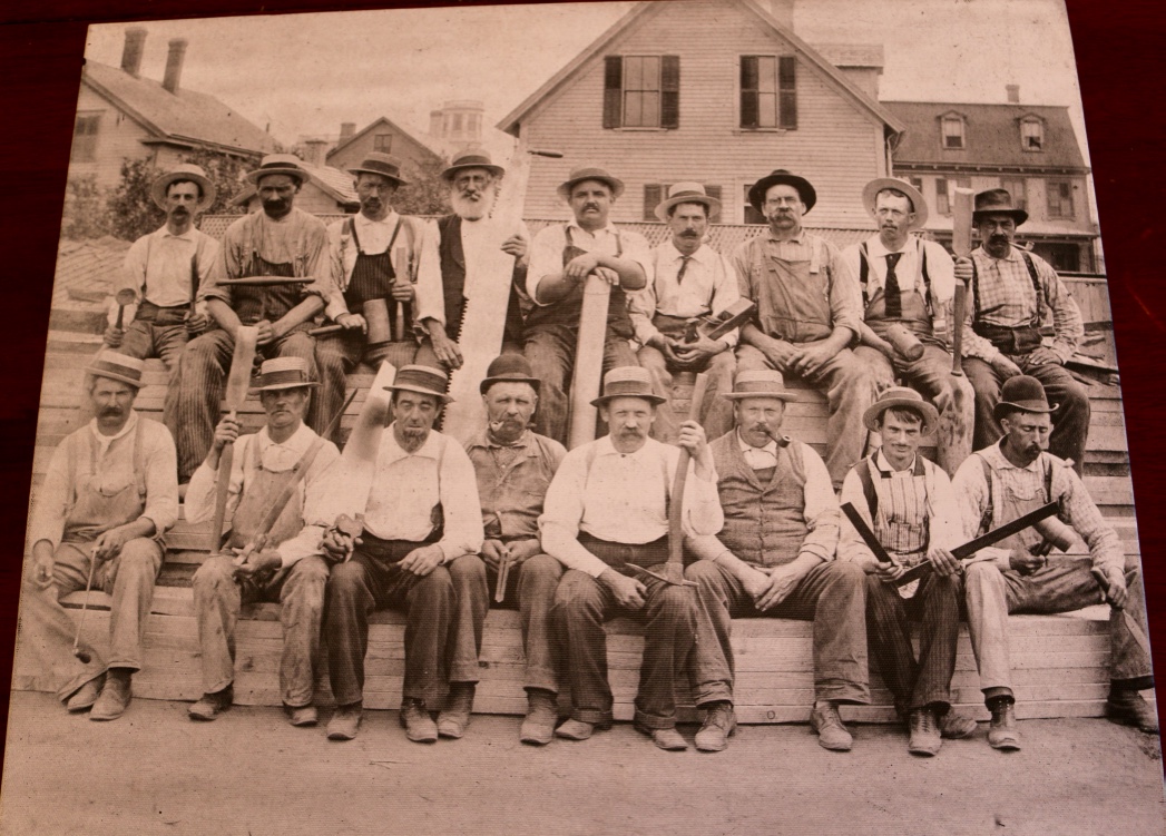 And last, but not least the photo above, on canvas, though a modern reprinting of an historic photo. It’s a great shot of carpenters and joiners in the mid-late 19th century. I’m making that date assumption based on the architecture in the background and the more modern lumber they are sitting on. Even though they are sitting on a fairly modern looking lumber, likely to be used in a balloon frame, the men are holding slicks, mallets, draw knives, chisels of the scale used for timber framing, an earlier pre-bailey bench plane, framing square, bits with wooden handles, an adze, boxwood rules, a hand saw, a two man crosscut saw etc. It looks to be an amazing image of the time when things were transitioning from the old ways and heavy timber work to lighter construction methods. Other things of note in this picture are the various hats, pipes, aprons and overalls the guys are wearing. The guy in the first row, third from the left who looks like he’s in pretty rough shape. The well dressed man in the front row, third from the right with no tools in his hand — was he the owner? Or the foreman? Often the man with the framing square in a photo like this is the master, but the young man to the right of the well dressed man does not look like he’s the most experienced out of this lot. There is also an unusual building behind the head of the bearded man holding the two man saw that might help identify where this photo was taken. The seller thought it might be from southern MA, in the New Bedford or Fall River area. So if anyone has any further insights to add, please add them to the comments below. The photo opens up as many questions as it answers and will look nice hanging up out in my workshop.